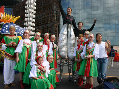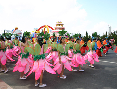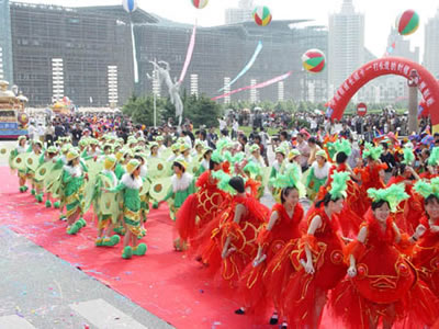 在遍布大連城100多個廣場上,形式多樣的民間文體活動,與狂歡節(jié)巡游隊伍遙相呼應。