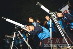 根據(jù)北京天文館專家預(yù)測的時間,神六飛船昨天共有兩次光臨北京。無奈天公不作美,密布的烏云集聚北京上空,清晨4時34分左右,神六悄然溜過一次;5時30分,黃松峪中學(xué)的一些天文愛好者在學(xué)校實驗大樓前架起5架天文望遠鏡,欲一睹神六風(fēng)采。他們踮起腳,伸長脖子,努力把眼睛貼上望遠鏡,但仍沒有親眼看到神六飛臨北京。該校一名初中二年級的學(xué)生展平說,他以前曾觀看過流星等天文現(xiàn)象,對神六飛船非常向往,希望能親眼看到神六。