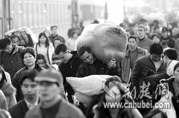 連日來,武昌火車站,滾滾旅客流中,背著大包小包的返鄉(xiāng)農(nóng)民工明顯增多了(上圖)。一年辛勞,收獲頗豐,農(nóng)民工露出了開心的笑容(下圖)。記者采訪得知,他們提前返鄉(xiāng),一方面是想避開春運(yùn)高峰,同時(shí)也想多一些和家人團(tuán)聚的時(shí)間。(記者張磊田悅攝)