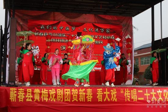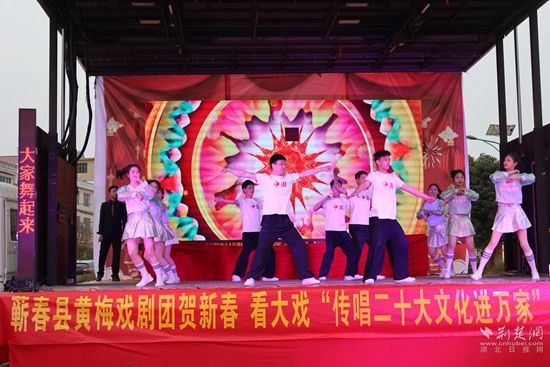 荊楚網(wǎng)(湖北日?qǐng)?bào)網(wǎng))訊(通訊員凌敏、程楚輝)2月2日,由蘄春縣委宣傳部、縣文化和旅游局、株林鎮(zhèn)人民政府聯(lián)合主辦的“我們的中國(guó)夢(mèng)文化進(jìn)萬家暨蘄春縣貫徹落實(shí)二十大精神+送戲下鄉(xiāng)”惠民文化演出走進(jìn)當(dāng)?shù)劓?zhèn)村一線,用黃梅戲表演唱等形式,把黨的二十大精神送到老百姓家門口,贏得群眾一片叫好聲。