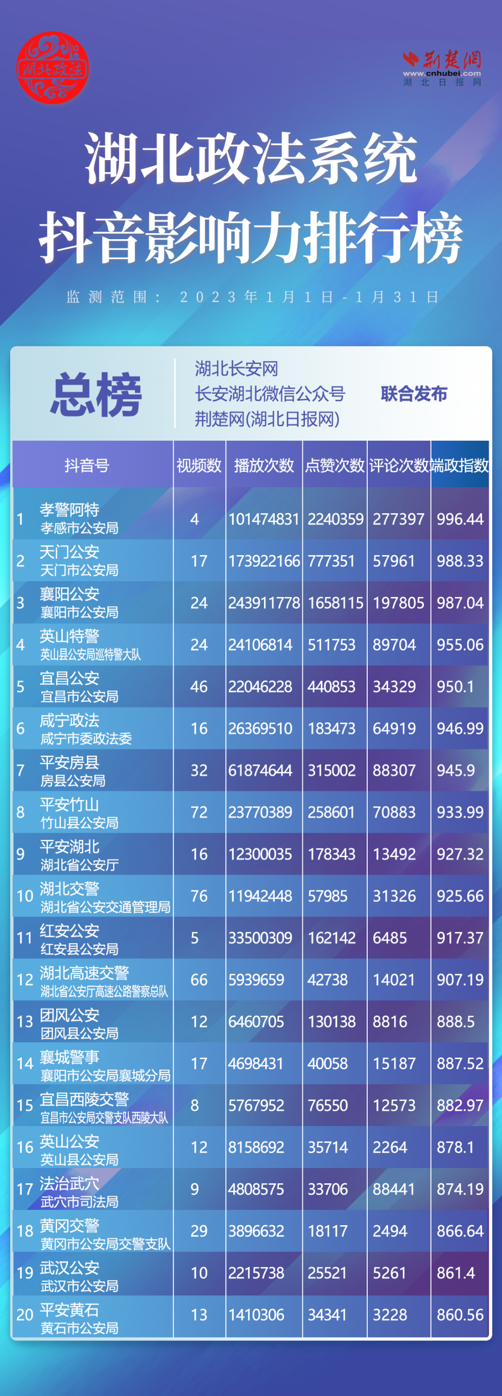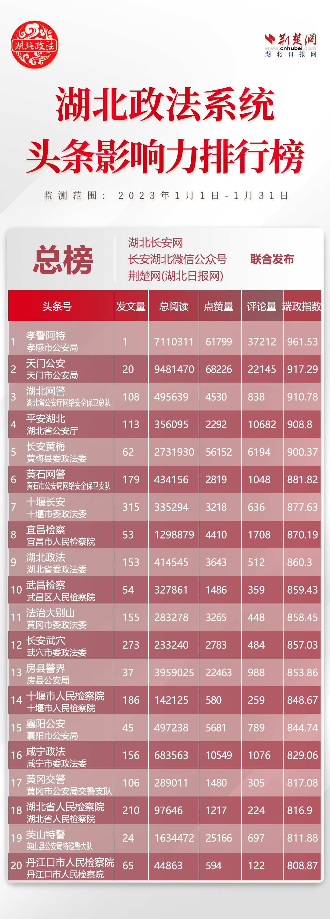 湖北政法系統(tǒng)681個(gè)頭條帳號(hào)參加評(píng)選,其中政法委系統(tǒng)123個(gè)、法院系統(tǒng)128個(gè)、檢察系統(tǒng)130個(gè)、公安系統(tǒng)141個(gè)、司法系統(tǒng)159個(gè)?!伴L安黃梅”、“法治大別山”、“長安武穴”、“黃岡交警”、“英山特警”5家單位強(qiáng)勢上榜,分別排名第5位、第11位、12位、17位、19位。