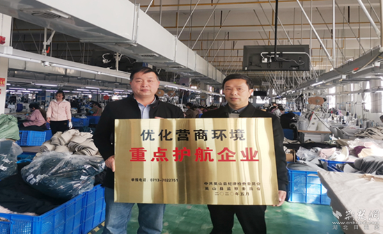 此前,英山縣紀委監(jiān)委“護航”行動專班在對全縣重點企業(yè)進行走訪時,湖北如普帽業(yè)有限公司反映該公司門口的“優(yōu)化營商環(huán)境重點護航企業(yè)”牌匾是2020年5月懸掛的,因常年風(fēng)吹日曬,導(dǎo)致字跡斑駁不清。隨后,該縣紀委監(jiān)委將這一問題納入工作臺賬,立即協(xié)調(diào)重新制作牌匾,于是便有了開頭“換牌”的一幕,這也是該委深化“護航行動”的一個生動體現(xiàn)。