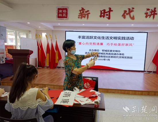 荊楚網(wǎng)(湖北日報網(wǎng))訊(通訊員 丁元中)一刀一剪揚正氣,一毫一厘頌清風(fēng)。7月12日上午,鄂城區(qū)鳳凰街道南塔社區(qū)聯(lián)合鄂州市婦聯(lián)、鄂城區(qū)婦聯(lián)、鳳凰街道婦聯(lián)開展了“童心向黨剪清廉,巧手繪蓮好家風(fēng)”剪紙活動,將廉政素材與傳統(tǒng)剪紙相結(jié)合,用民俗藝術(shù)展現(xiàn)清廉之風(fēng)。