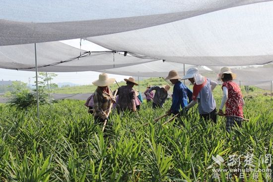 荊楚網(wǎng)(湖北日報網(wǎng))訊(通訊員 葛昆樂 馬先禮)8月4日上午,位于鄂城區(qū)汀祖鎮(zhèn)劉顯村的鄂城黃姜育種示范基地里,120畝黃姜長勢喜人,十多名工作人員正在進(jìn)行田間管理,為黃姜施肥、鋤草。