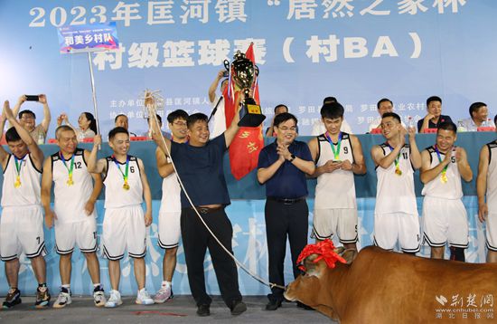 當晚7點,隨著哨聲響起,和美鄉(xiāng)村隊與豹龍隊展開激烈角逐。雙方隊伍配合默契,帶球、傳球、上籃一氣呵成,內(nèi)線強打、后仰跳投、三分遠投精彩不斷,贏得了場內(nèi)外觀眾的陣陣歡呼。隨著終場哨響,比分定格在84:59,和美鄉(xiāng)村隊最終奪得匡河鎮(zhèn)“居然之家杯”村級籃球賽男子組的冠軍,成功牽走“冠軍?!薄?/p>