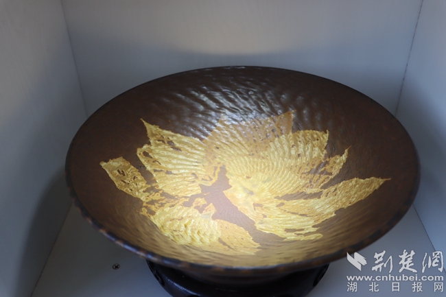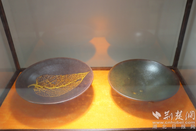 將天然樹葉燒制于盞上,盞里倒上水,盞內(nèi)木葉莖脈清晰,或卷或舒,仿若在水中漂。在工作室,何登明向記者展示著他的得意之作——仿宋吉州窯木葉盞。