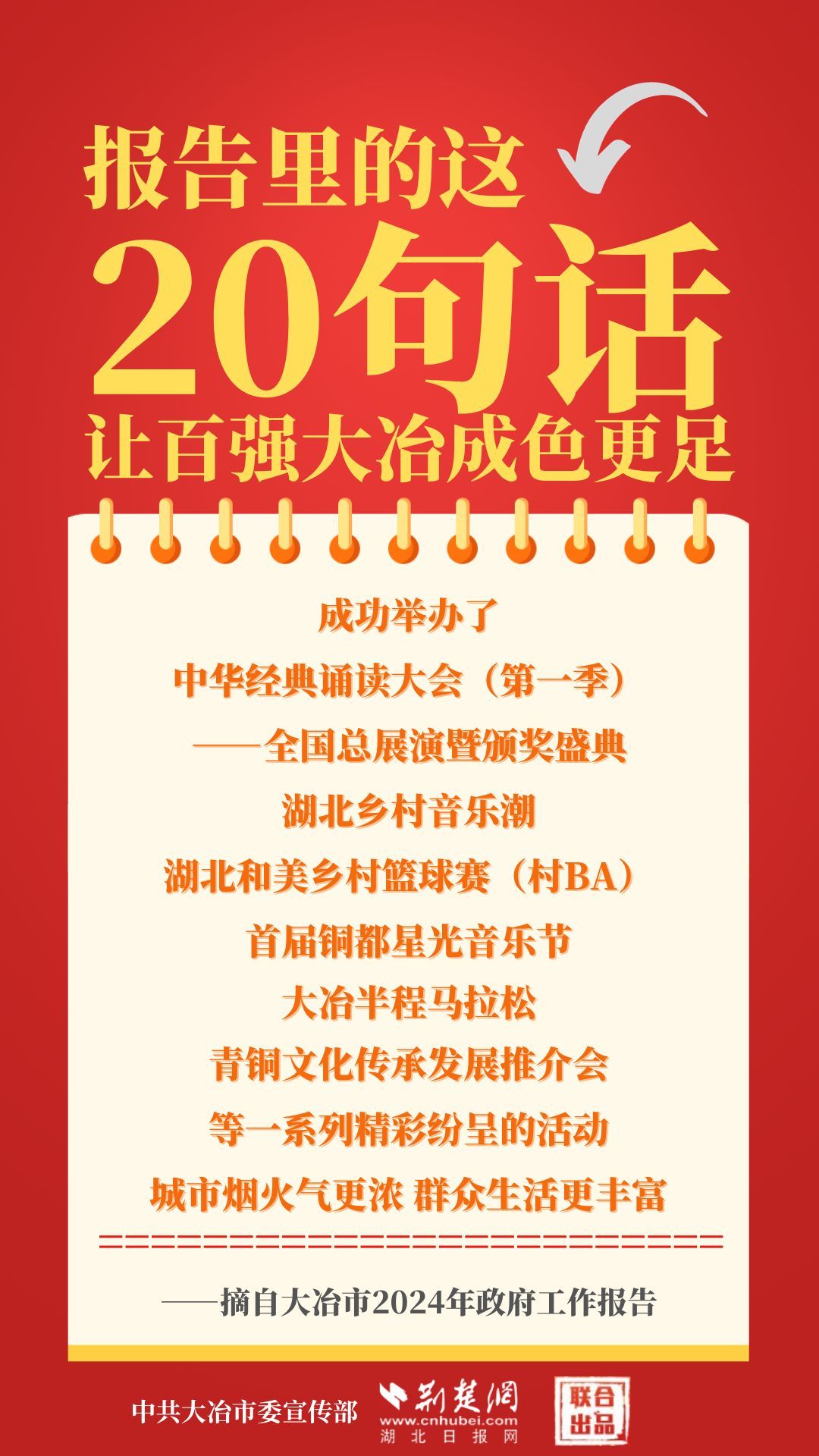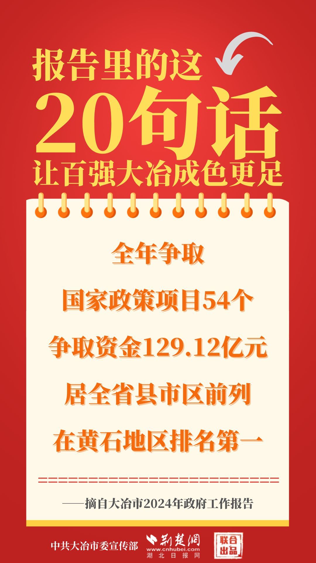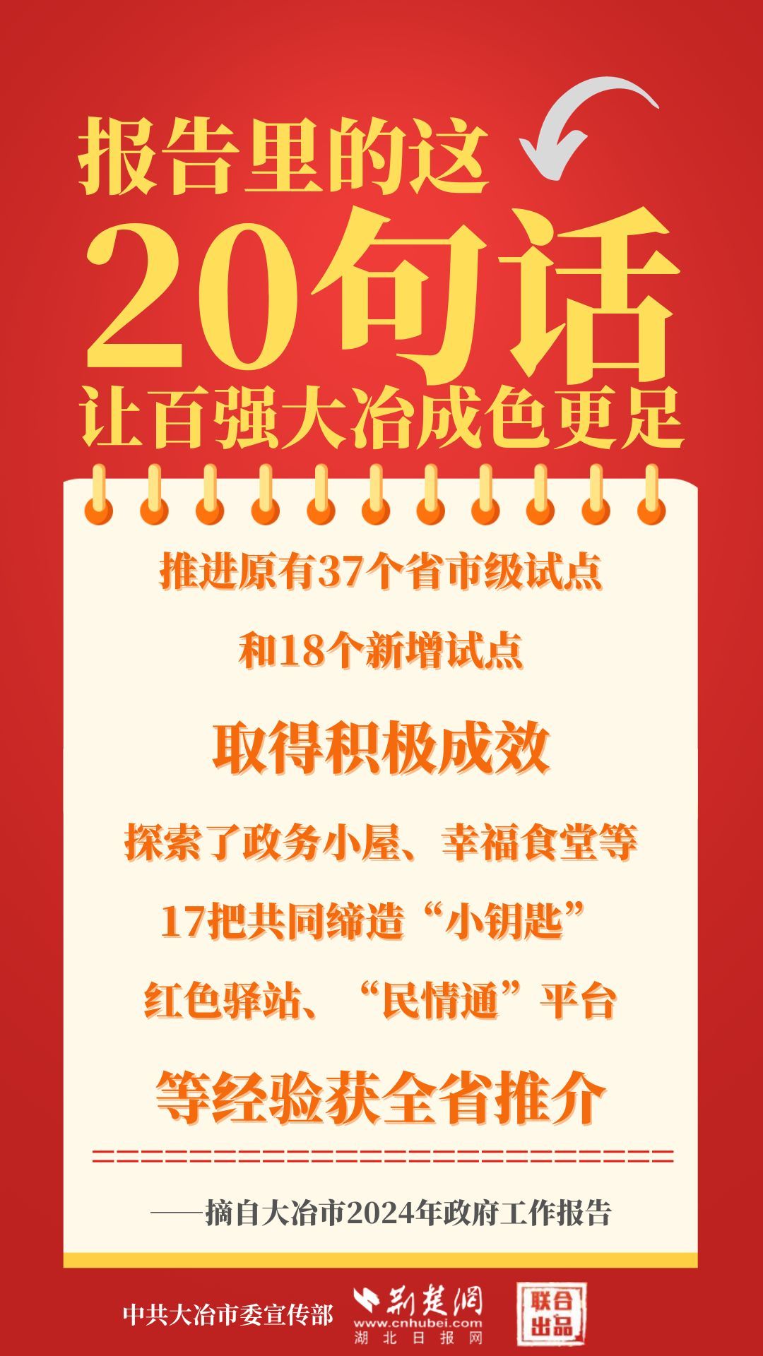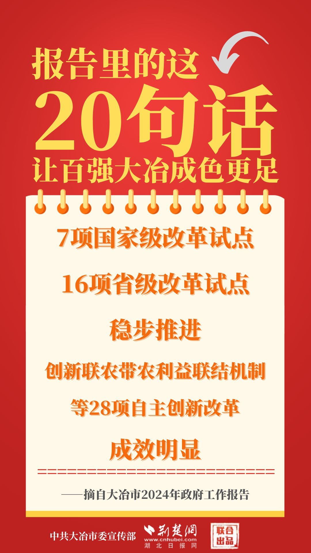 1月12日,大冶市第七屆人民代表大會第四次會議開幕,大冶市委副書記、市長孫輒作政府工作報(bào)告。報(bào)告里的這20句話,讓百強(qiáng)大冶成色更足。