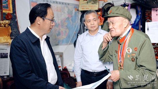 當(dāng)天上午,黃石市委宣傳部副部長(zhǎng)、市委網(wǎng)信辦主任萬金光,黃石市退役軍人事務(wù)局黨組書記、局長(zhǎng)陳鵬圖一行參加啟動(dòng)儀式,并前往抗美援朝老戰(zhàn)士瞿介昌住處看望。他們向瞿介昌老戰(zhàn)士簡(jiǎn)單介紹了本次主題報(bào)道情況,向這位老英雄獻(xiàn)上了鮮花,表達(dá)了對(duì)退役軍人的敬意,并為“致敬英雄”采訪團(tuán)授旗。