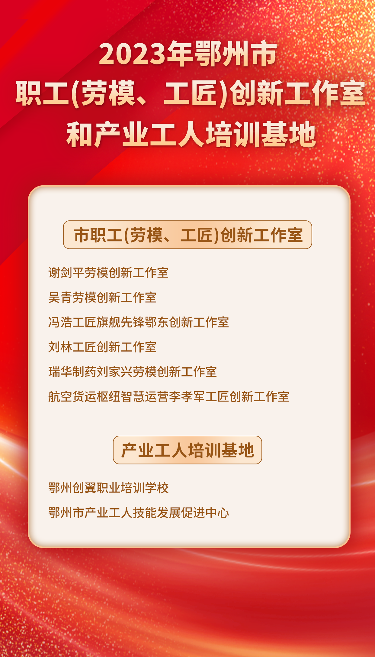 4月22日上午,在2024年鄂州市雙“百千萬”勞動(dòng)和技能競賽啟動(dòng)式上,鄂州公布2023年全市“六級體系”勞動(dòng)競賽先進(jìn)集體及先進(jìn)個(gè)人名單,并公布2023年鄂州市職工(勞模、工匠)創(chuàng)新工作室和產(chǎn)業(yè)工人培訓(xùn)基地。