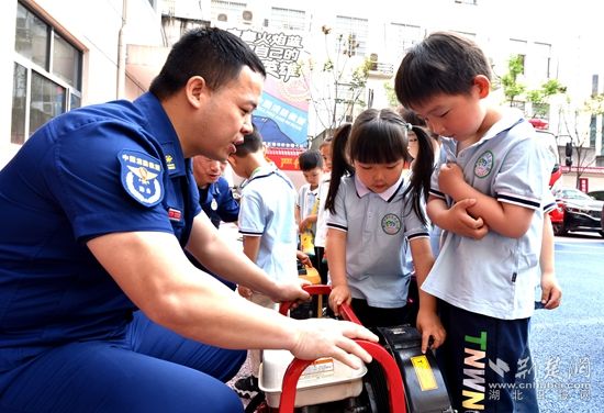在消防車庫,消防員邀請小朋友們登上消防車,展示了各類滅火、救援裝備的使用方法及功能用途。“小朋友們,這是液壓破拆工具,當(dāng)有人員被卡住無法直接救出的時候,就會使用它來進(jìn)行擴張。”“平時你們一定要多當(dāng)心扶梯、門縫、健身器材這些有孔縫的部位,防止意外事故發(fā)生哦!”消防員邊介紹,邊提醒小朋友們注意身邊安全隱患。
