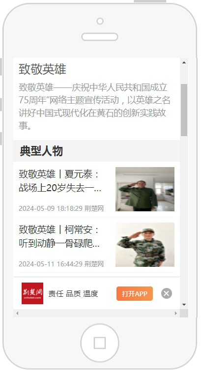 為向歷史開掘精神資源,營造崇尚英雄、學(xué)習(xí)英雄、關(guān)愛英雄的濃厚氛圍,黃石市委網(wǎng)信辦、市退役軍人事務(wù)局聯(lián)合荊楚網(wǎng)(湖北日報網(wǎng))啟動《致敬英雄》大型網(wǎng)絡(luò)專題宣傳。