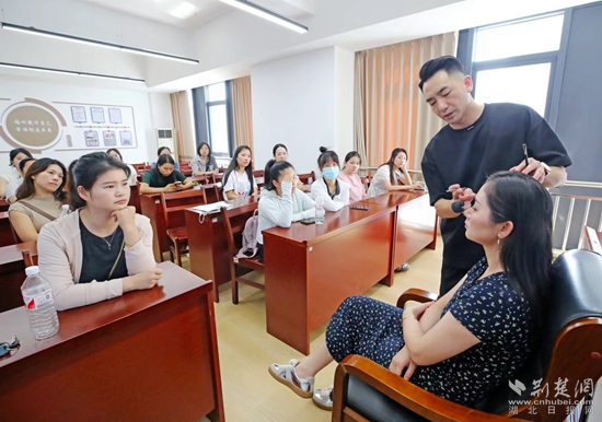 培訓(xùn)室內(nèi),30名通過人社“一湖三鏈”數(shù)據(jù)湖+就業(yè)服務(wù)站鐵腳板匹配的女性居民,正在接受來自盛美化妝美甲培訓(xùn)技能學(xué)校的就業(yè)指導(dǎo)師周艷君的精準培訓(xùn)。