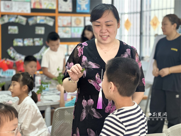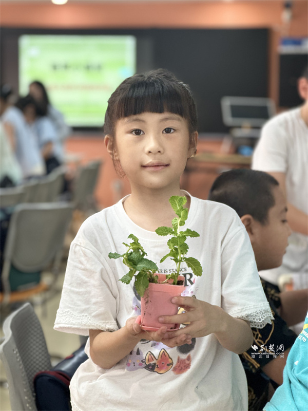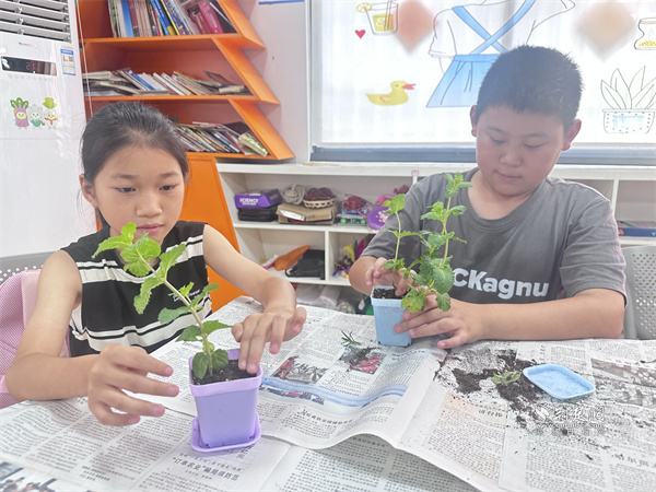 種植環(huán)節(jié)中,周帆帶著薄荷苗、花盆和泥炭土,手把手指導填土、定植、澆水。孩子們邊操作邊交流,指尖沾著泥土也興致勃勃。武漢市青山區(qū)鋼城第十九小學學生彭思瑞笑言:“我是托管班‘老學員’,連續(xù)三年參加暑期托管班,在這里上課比打游戲更有成就感,泥土的味道讓我很放松?!?/p>