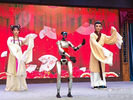 白天,智能機器人登臺唱起經(jīng)典黃梅戲,聲聲入耳;靈活的機器狗躍動翻騰,引得觀眾連連喝彩。機器人巡游隊伍更是“身懷絕技”,握手、跳舞等表演樣樣在行,游客爭相互動合影。