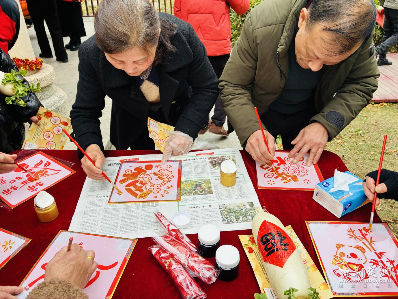 手工體驗(yàn)區(qū)則充滿(mǎn)了濃厚的文化韻味,大家在志愿者的指導(dǎo)下,將雕刻著不同書(shū)體“?!弊峙c馬年吉祥紋樣的模板,小心翼翼拓印在紅色宣紙上。當(dāng)一幅幅帶著墨香的福字躍然紙上,不僅定格了傳統(tǒng)技藝的獨(dú)特魅力,更承載著大家對(duì)新年福氣盈門(mén)的美好期盼。“我拓了一個(gè)‘?!郑蛩銕Щ丶屹N在門(mén)上,希望新的一年全家都福氣滿(mǎn)滿(mǎn)!”一位年輕媽媽舉著自己的作品,開(kāi)心地分享道。