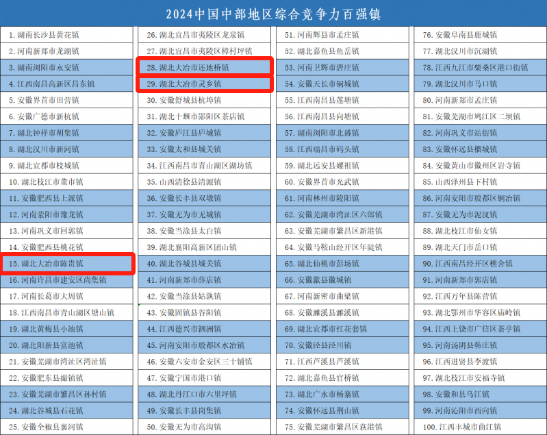 荊楚網(wǎng)(湖北日?qǐng)?bào)網(wǎng))訊(記者左乙辰 通訊員 陳向東 羅蒙 范國(guó)安)近日,2024年鄉(xiāng)鎮(zhèn)高質(zhì)量發(fā)展交流會(huì)在湖南長(zhǎng)沙召開(kāi),會(huì)上揭曉了2024年中國(guó)中部地區(qū)綜合競(jìng)爭(zhēng)力百?gòu)?qiáng)鎮(zhèn)名單,大冶市陳貴鎮(zhèn)、還地橋鎮(zhèn)、靈鄉(xiāng)鎮(zhèn)上榜,分列第15、28、29位。