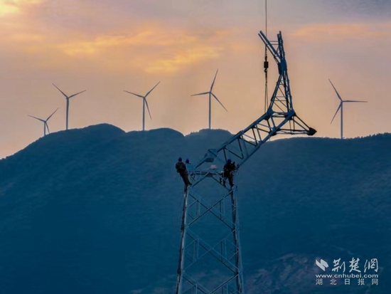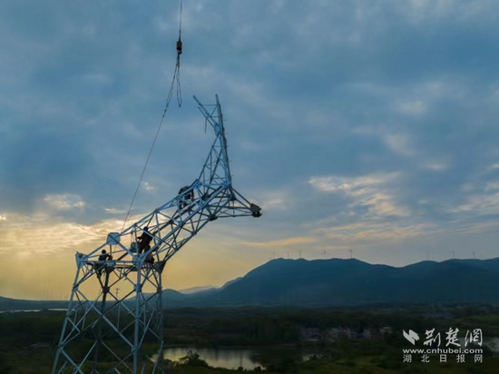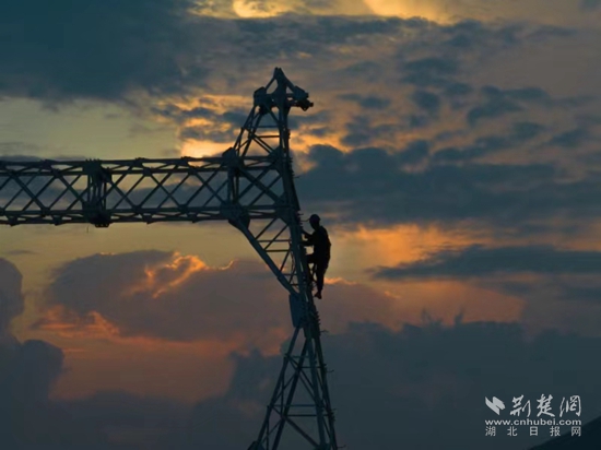 當(dāng)天下午6點(diǎn),夕陽染紅了天際。在斜輝映照下,4名電力工人挺立在鐵塔上,準(zhǔn)備最后的螺栓緊固工作。