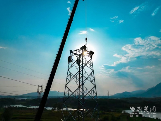 荊楚網(wǎng)(湖北日報(bào)網(wǎng))訊(通訊員曹祥魁 袁勝)8月23日下午5點(diǎn),黃石陽新縣陶港鎮(zhèn)祠堂畈附近,40多米高鐵塔上4名電力工人渾身濕透,他們扶著頭頂上吊車吊過來的鐵部件,開始了最后“一吊”的組塔工作。