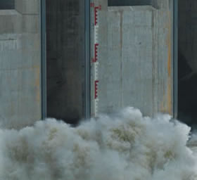 大壩下游,浪花濺上68米標(biāo)尺點。