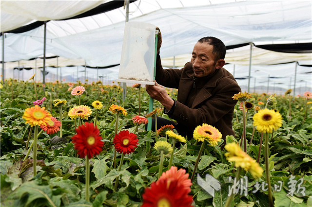 2月20日,湖北省通城縣石南鎮(zhèn)賽公村非洲菊種植專業(yè)合作社社員在管護(hù)非洲菊。