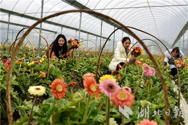2月20日,湖北省通城縣石南鎮(zhèn)賽公村非洲菊種植專業(yè)合作社社員在采摘非洲菊供應(yīng)市場。