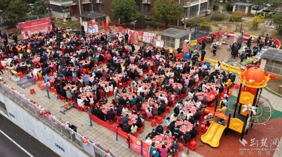 2月7日,臘月二十,咸安區(qū)浮山街道香城社區(qū)書苑小區(qū)廣場上,60張圓桌依次排開,700多位居民攜家?guī)Э诟斑@場鄰里之約,啤酒燒鴨的濃香、合菜面的爽口在空氣中交織,舞獅鑼鼓與歡聲笑語相映成趣。這場“我們的節(jié)日·春節(jié)”社區(qū)百家宴,正是咸寧社區(qū)文化節(jié)的生動(dòng)縮影。